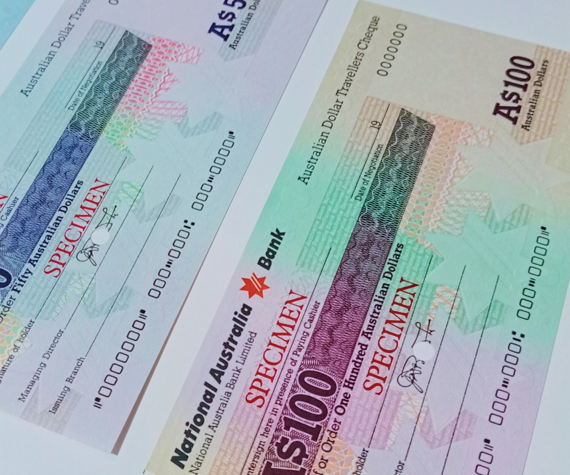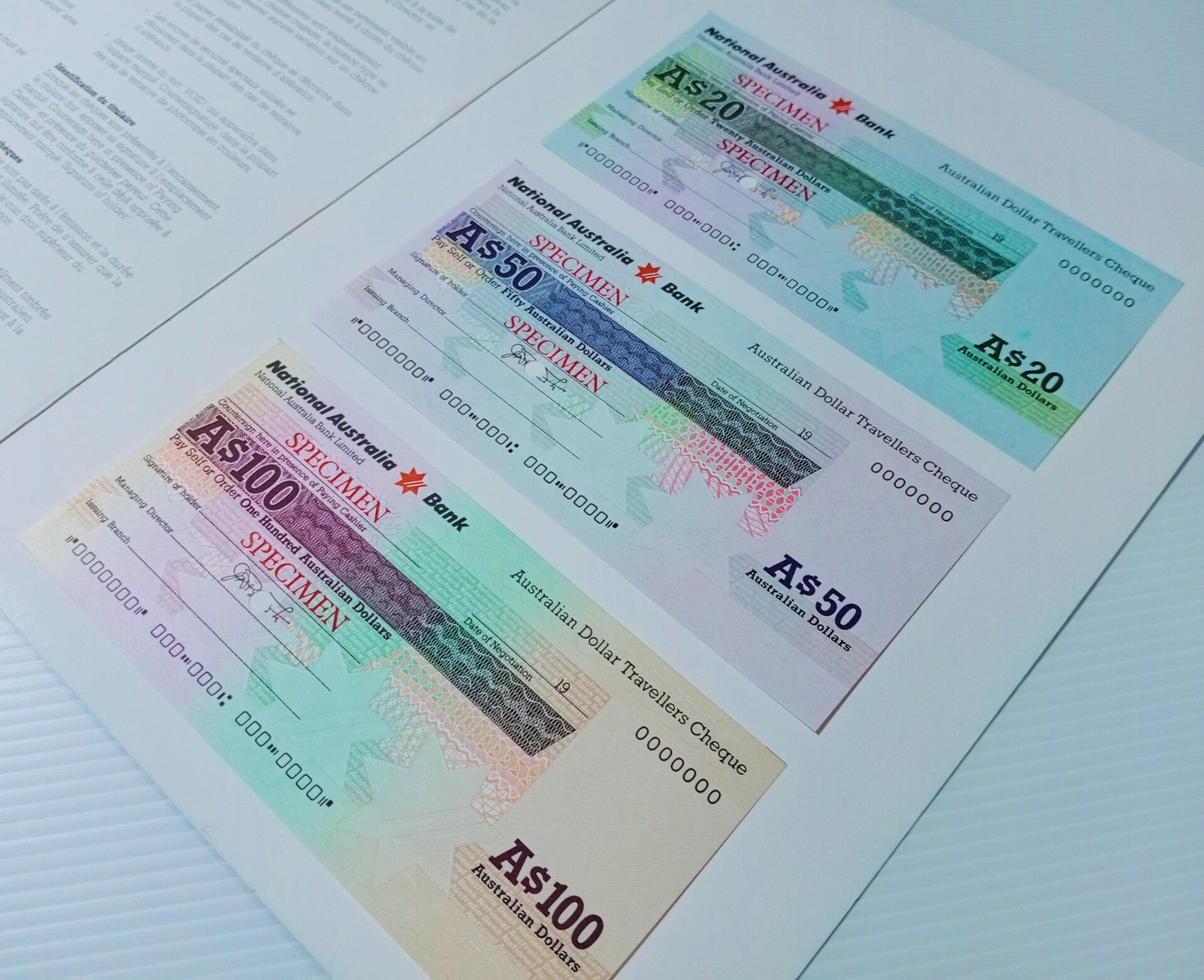 NATIONAL AUSTRALIA BANK TRAVELLERS $20$50$100 CHEQUES UNC SPECIMAN