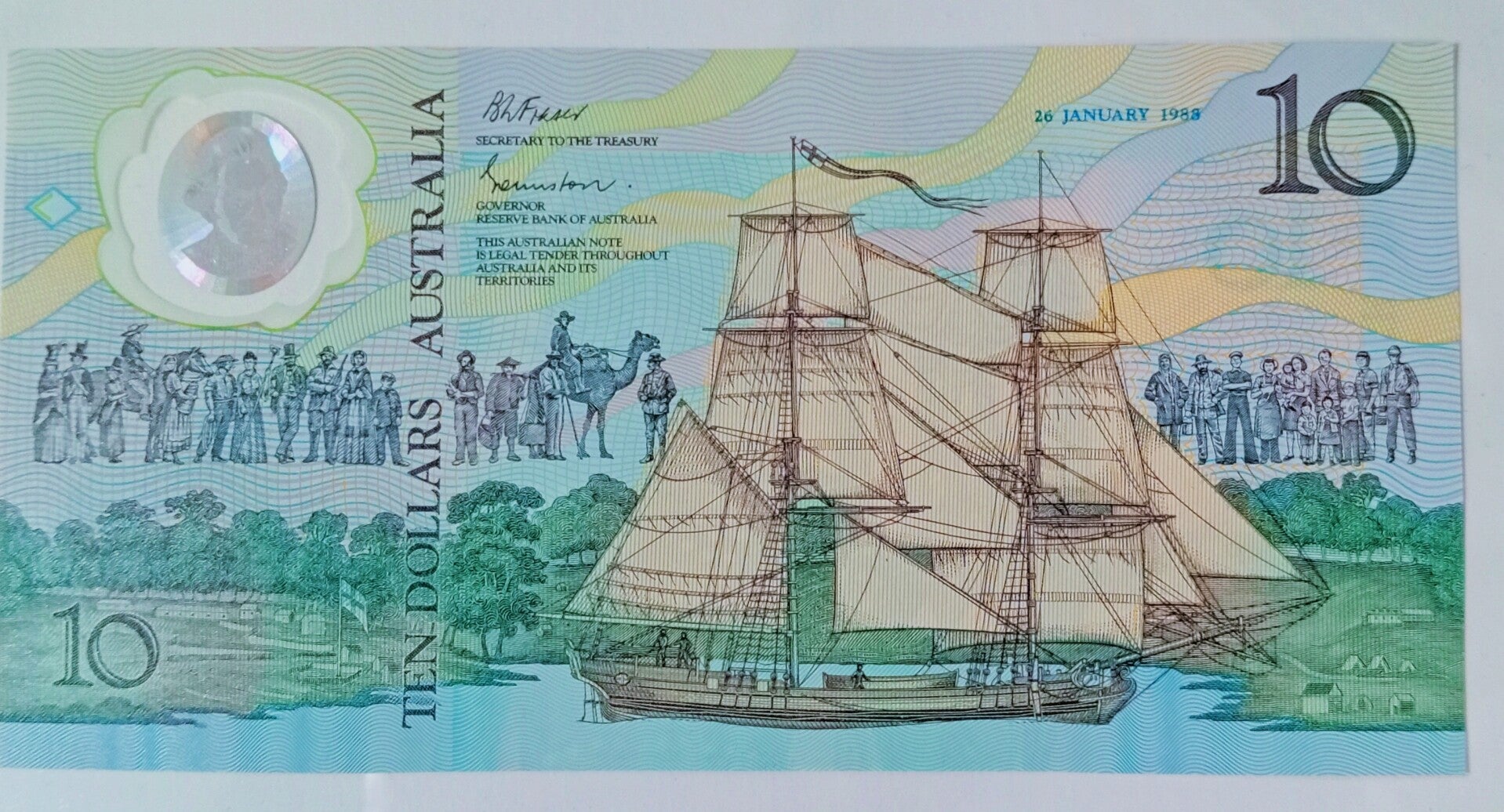 On January 27, 1988, the Reserve Bank of Australia released for the first time the commemorative 10 dollars 1988 banknote. It was developped by the Reserve Bank of Australia, The University of Australia and the Commonwealth Scientific and Industrial Research Organisation to enhance the security of australian currency and it was the first modern polymer banknote issued worldwide.