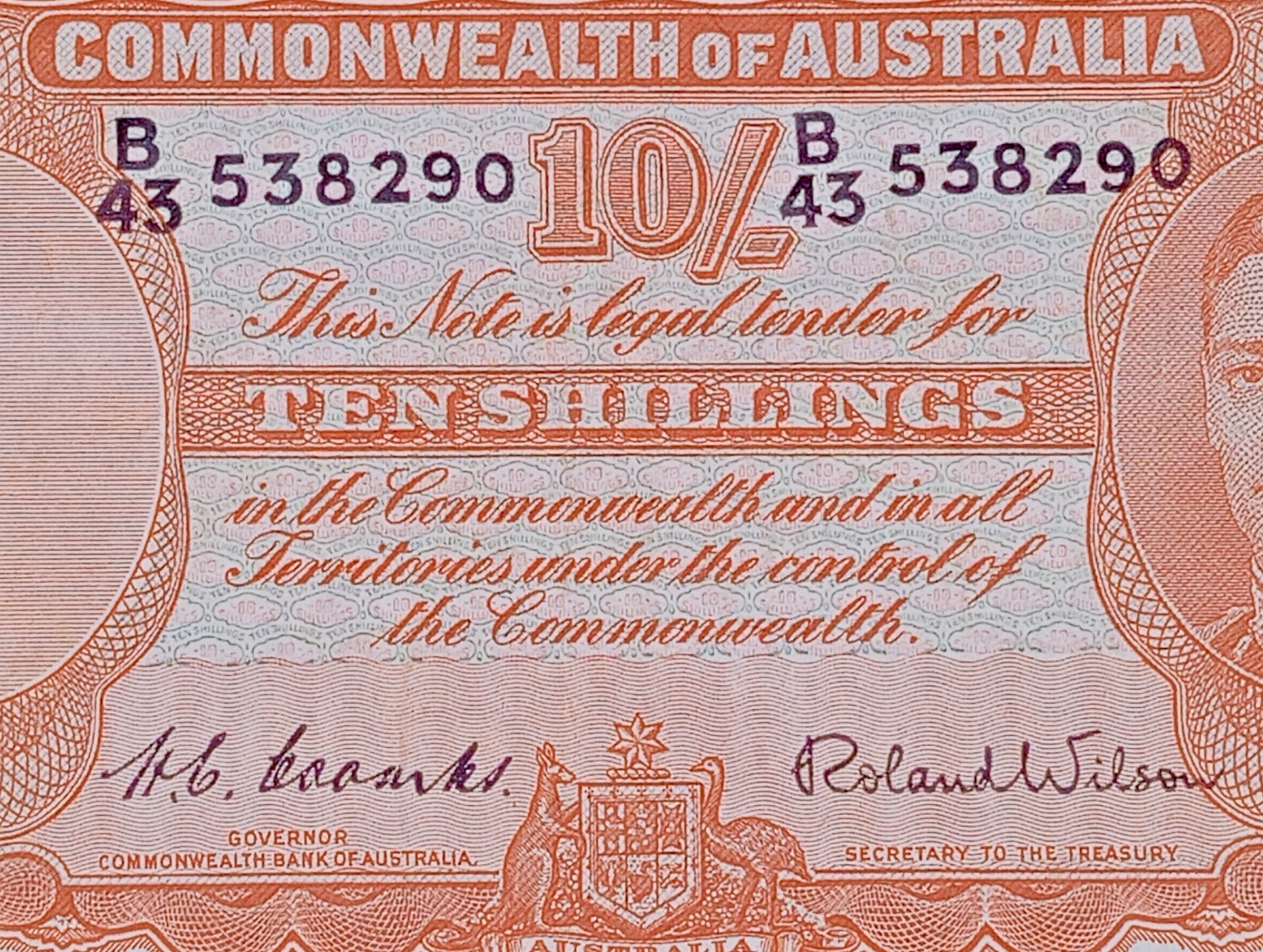 1952 10 Shillings B43 538290 Australia R15 Coombs & Wilson Signatures.